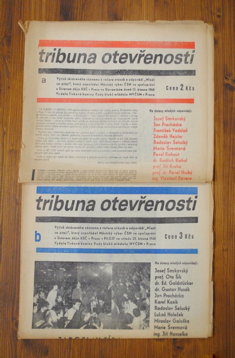 2 výtisky (a+b) se zkráceným záznamem večera otázek a odpovědí ve Slovanském domě 13.3. a v PKOJF 20.3.1968, vyst. např. J. Smrkovský, J. Procházka, P. Kohout, J. Kroha, O. Šik, G. Husák, K. Kosík, aj., trochu opotřebené okraje, zažloutlý papír