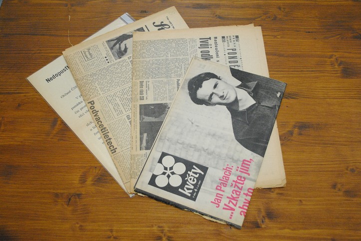 1x Svobodné slovo 20.1.1969 ("Jan Palach zemřel"), 1x Mladá fronta 27.1.1969 ("Rozloučení s Janem Palachem"), 1x týdeník Květy č. 4, 1.2.1969 (pouze listy, bez hřbetu), 1x tištěný leták Akčního výboru pražských studentů a předsednictva SVS "Nedopusťte zneužití pohřbu Jana Palacha", 2x strojopis (Informace z 18. ledna o hladovce dvou studentů a o "protestech proti politice, která začala zabíjet" a konání mítinků; Výzva účastníkům průvodu Svazu pražských středoškoláků z 25.1.1969), dobrý stav, zažloutlý papír