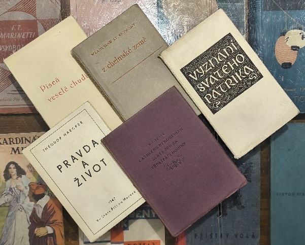 obs.: 1) T. Haecker: Pravda a život, 1947, pův. brož, 57s., velmi dobrý stav; 2) W.B. Yeats: CAthleen Ni Houlihan, Zlatá přilba, Přesýpací hodiny, 1921, pův. brož, 77s., dobrý stav; 3) Píseň veselé chudiny, 1932, ex. 228//300 na ručním Zandersu, pův. brož, 18s., dobrý stav; 4) W. Reymont: Z chelmské země, 1939, ex. 72/100 na ofsetu, frontispis M. Florian, pův. brož, 76s., zkosený hřbet, jinak dobrý stav a 5) Vyznání svatého Patrika a list lidem poddaným vladaři Korotichovi, 1946, ex. 471/1000, dřevoryty M. Florian, pův. brož, 46s., blok listů uvolněn z pap. ob., dobrý stav