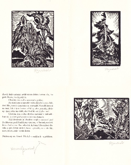 3x sign. dřevoryt a podpis za textem A. Hrabal, ke grafikovým 80. narozeninám vyd. Vl. Bujárek, nedat., volné listy v ob., dobrý stav