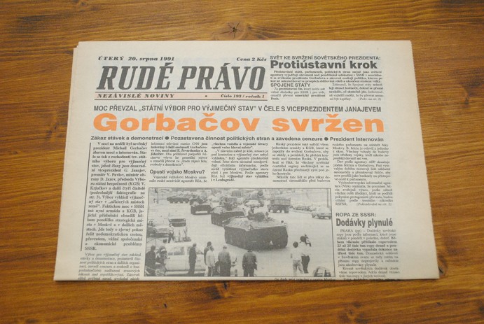 Rudé právo s titulní stranou "Gorbačov svržen" z 20. srpna 1991, dobrý stav, zažloutlý papír