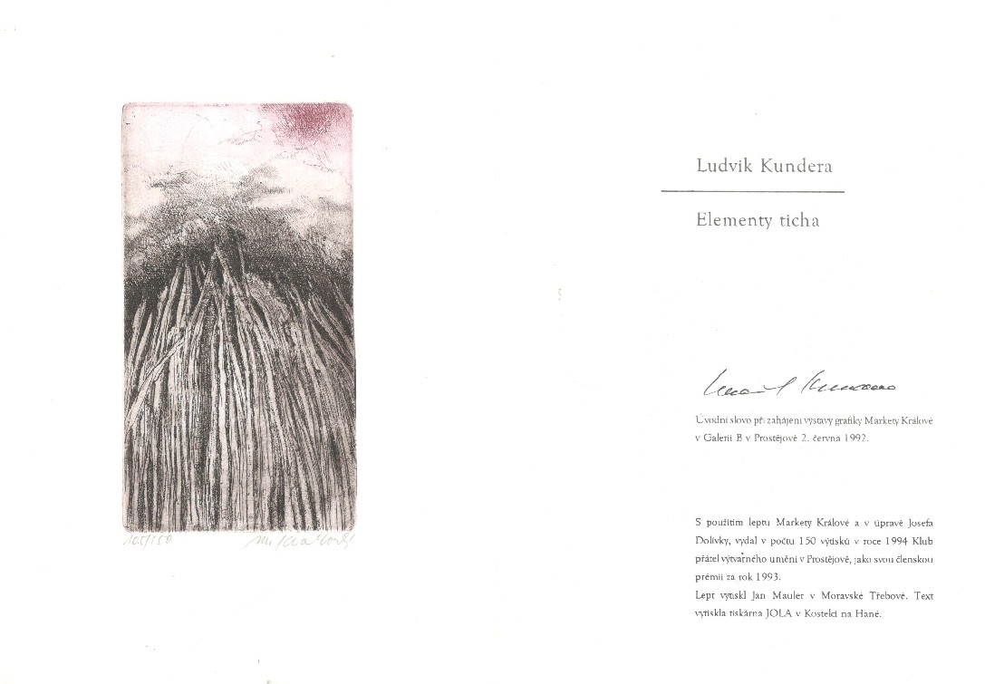 sign. lept ve frontispisu M. Králová, podpis Ludvíka Kundery na tit. listě, vyd. Klub přátel výtv. umění, Prostějov, 1994, ex. 105/150, volné listy, pěkný stav