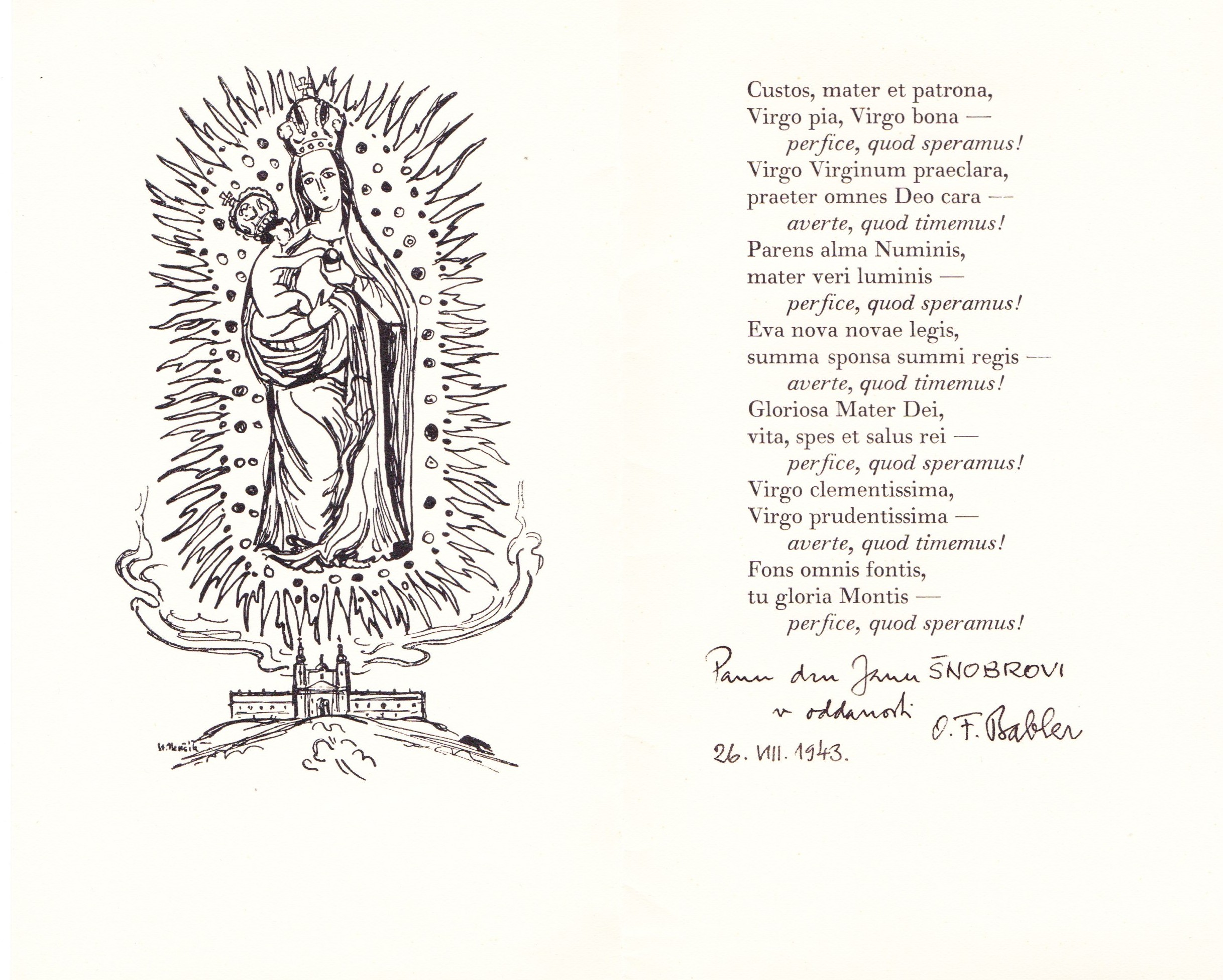 podpis s dedikací Janu Šnobrovi O.F. Babler, rozkládací dvojlist s básní "Litaniae", dobrý stav