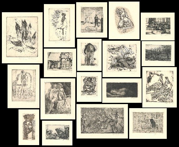 20x sign. grafický list maďarských autorů: 2x Csohány Kálman, Reich Károly, 2x Raszler Károly, 2x Molnár István, Gacs Gábor, Kondor Béla, Jurida Károly, Gross Arnold, Nagy Zoltán, Kontantin Lázsló, Szuts János, Varga Nándor Lajos, Rozanits Tibor, Csurgói Máté Lajos, Fery Antal, Bálványos Huba a Váci András; vyd. u příležitosti 10. světového kongresu ex-libris, Krakov, 19645, ex. 77/200, doprovodný text a medailonky autorů (maď/fr.) Szentes Lajos, volné listy (A4) v pův. clpl. pouzdře, lehce zažloutlý papír, velmi dobrý stav