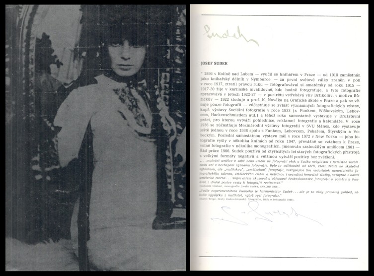 podp. pod medailonkem v těle knihy J. Sudek, vyd. Uměleckoprůmyslové muzeum, Praha, 1974, katalog k výstavě, vč. přílohy se seznamem vyst. prací, 1500 výtisků, pův. brož, bez paginace, lehce odřený hřbet, částečně odlepené listy, jinak dobrý stav