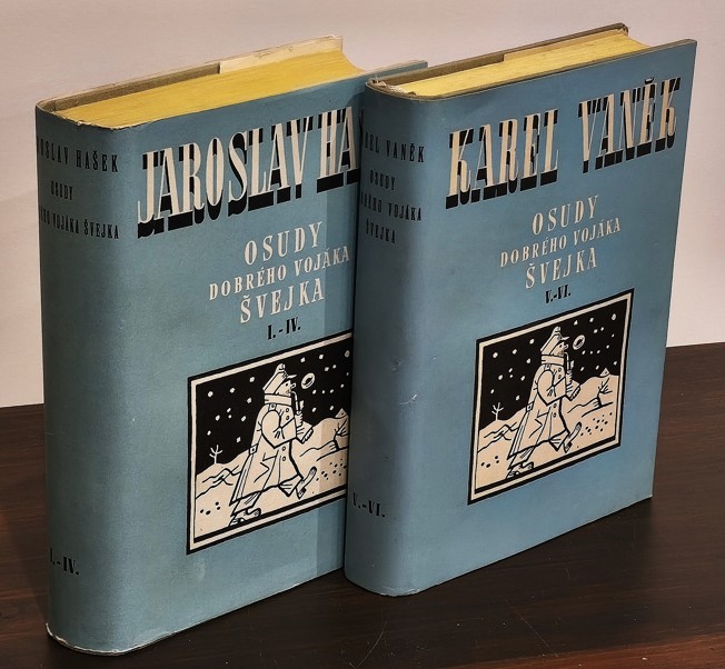 dvousvazkové exilové vydání Osudů vojáka Švejka od J. Haška (I.-IV.) a Karla Vaňka (druhá kniha, V.-VI.) s ilustracemi Josefa Lady, vyd. International Book Service Ltd., Montreal, 1952, 629+367s., 2x. pův. clpl. vazba s ob., oba svazky, včetně obálek, ve velmi dobrém a krásném stavu!