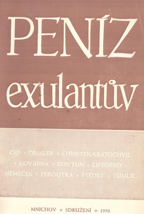 antologie exilové prosy, vyd. Sdružení ČS politických uprchlíků v Německu, Mnichov, 1956, jako III. svazek edice "Kamenný erb", sest. Ant. Kratochvíl, obs. texty: J. Čep, Fr. Listopad, J. Kovtun, F. Peroutka, Zd. Němeček, V. Štědrý, J. Tumlíř, J. Dresler (též doslov) a Fr. Kovárna, clpl. převazba, pův. ob. vevázána, 96s., zažloutlý papír, jinak dobrý stav