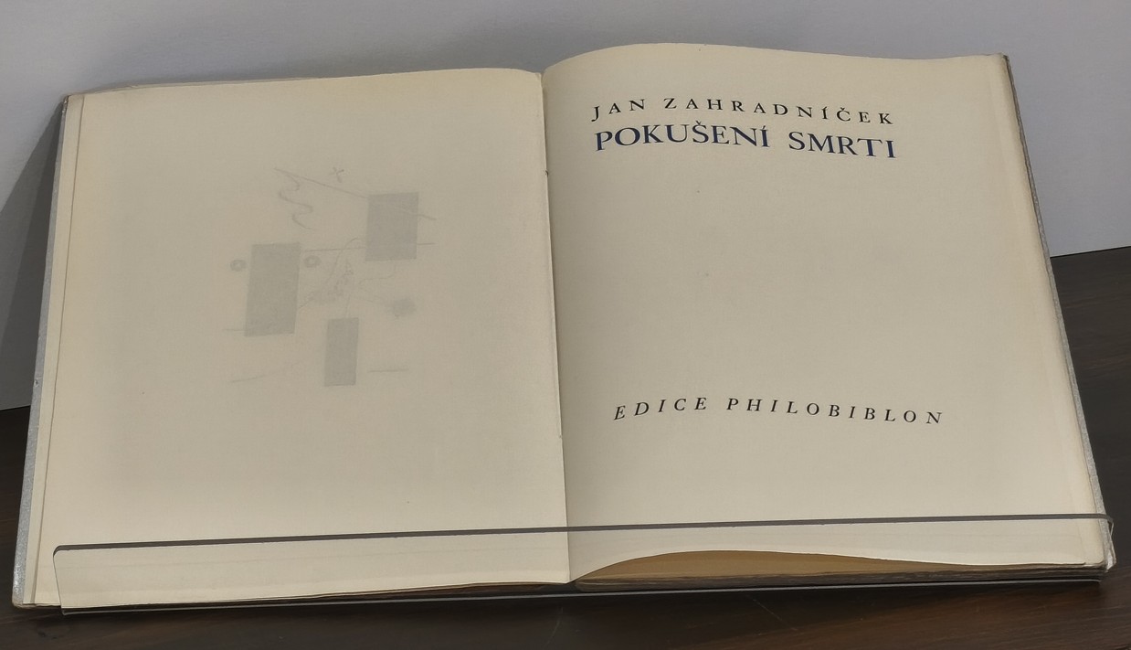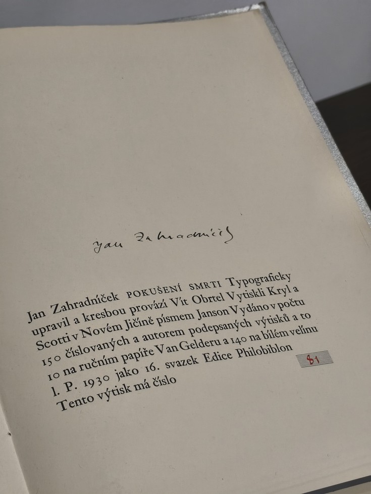 zcela ojediněle se objevující exemplář Zahradníčkovy sbírky básní s podpisem v tiráži, vyd. jako 16. svazek Edice Philobiblon, 1930, ex. 81/150, upravil a úvodní kresbou provází Vít Obrtel, tisk Kryl a Scotti v Novém Jičíně, pův. brož, 76s., chatrný a poškozený hřbet, rozvolněná předsádka, jinak dobrý stav