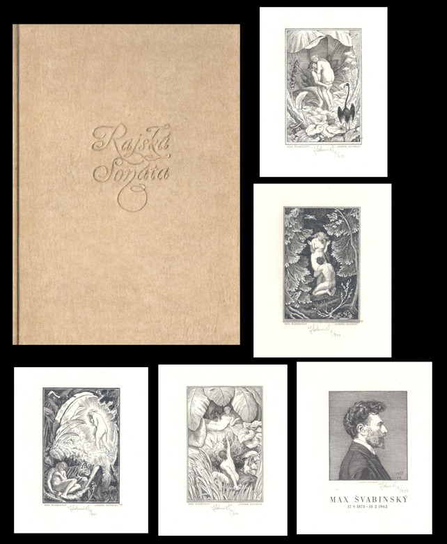 obs. 5 sign. dřevorytů M. Švabinského v ocelorytině J. Schmidta, vyd. v rámci oslav stého výročí narození M. Švabinského SČF Klub filatelistů, Kroměříž, 1973, ex. 1/300!, s podp. Zuzany Švabinské-Verjychové (text) a J. Schmidta (ocelorytiny) na patitulu, pův. karton. vazba, ruční papír, bez paginace + 5x volný list, velmi dobrý stav