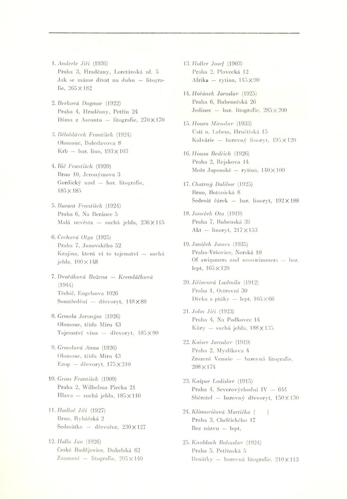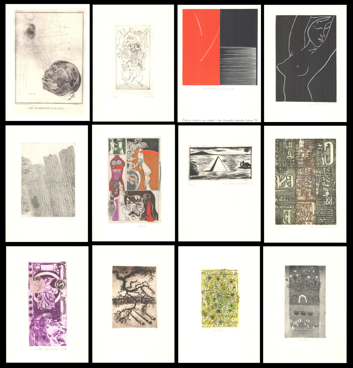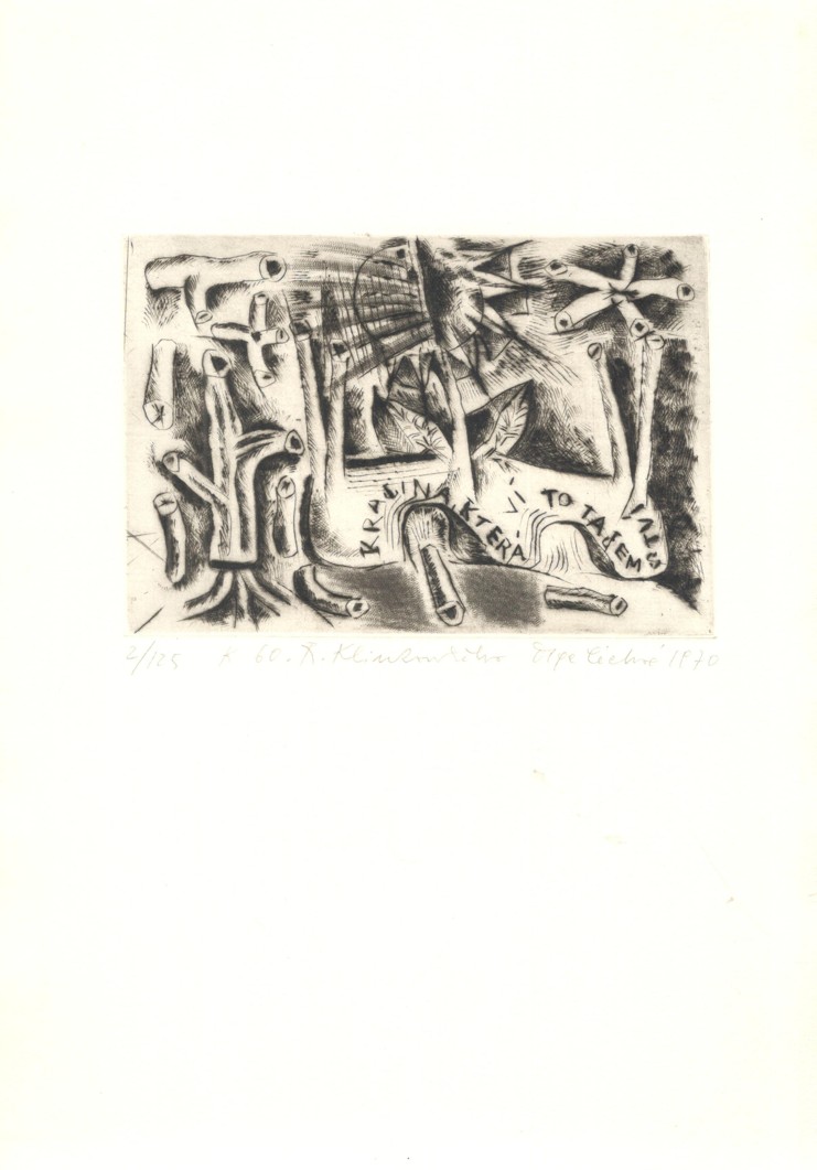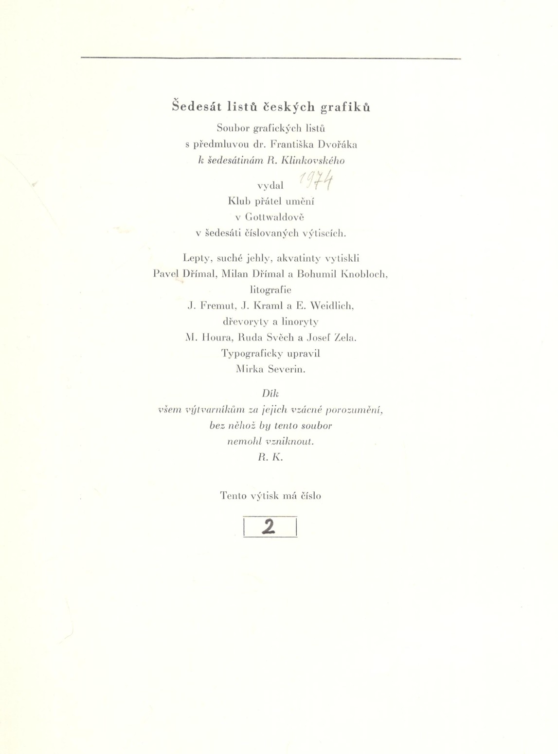 zcela výjimečný soubor 60 sign. grafických listů A4 s předmluvou dr. Františka Dvořáka (podp. s datací za textem) k šedesátinám R. Klinkovského; obs. především J. Anderle (lit), Fr. Gross (s.j.), D. Chatrný (bar. lin.), O. Janeček (lin.), J. John (s.j.), J. Liesler (bar. lept), K. Lhoták (s.j.), E. Ovčáček (bar. lept), K. Pacovská (bar. lept), B. Reynek (s.j.), Z. Seydl (lit.), Z. Sklenář (bar. lit.), P. Sukdolák (akvat.); dále obs.: grafické listy od: D. Berková, Fr. Bělohlávek, Fr. Bič, Fr. Burant, O. Čechová, B. Dvořáková-Kremláčková, J. Grmela, A. Grmelová, J. Hadlač, J. Halla, J. Holler, J. Hořánek, M. Houra, B. Housa, J. Janíček, L. Jiřincová, J. Kaiser, L. Kašpar, M. Klimovičová, B. Knobloch, E. Kotrba, P. Kryštof, J. Lukavský, A. Matasová, Fr. Mentlík, Z. Mézl, R. Michal, K. Müller, Fr. Nikl, K. Oberthor, J. Pešicová, Fr. Peterka, V. Polášek, P. Rolčík, J. Severová, V. Sivko, V. Suchánek, K. Svolinský, N. Synecká, J. Šerých, J. Šváb, J. Švengsbír, E. Tomanová, J. Uiberlay, V. Vaculka, Vl. Komárek a E. Weidlich; lepty, suché jehly a akvatinty vytiskli P. Dřímal, M. Dřímal a B. Knobloch, litografie tiskli J. Fremut, J. Kraml a E. Weidlich a dřevoryty a linoryty M. Houra, Ruda Svěch a Josef Zela; vyd. Klub přátel umění v Gottwaldově, 1974, ex. 2/60, typ. upr. M. Severin; k albu volných listů v karton. deskách přiložen dopis z 5.12. 1974 paní Klinkovské o zařazení listu Vl. Komárka namísto K. Vysušila, který grafický list nedodal; obs. též tištěný seznam grafických listů s údaji o technice a rozměru; každý grafický list vzadu očíslován (1-60), velmi dobrý stav!