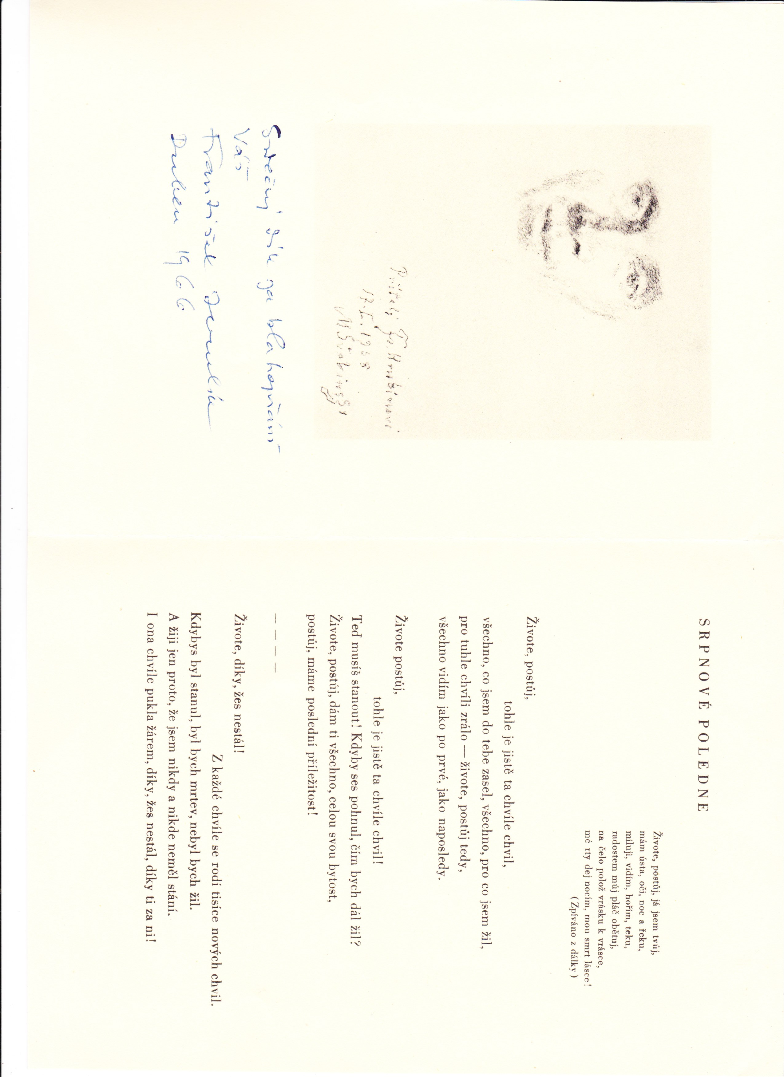 podp. s věn. Fr. Hrubín, dvojlist s básní "Srpnové odpoledne", 21 x 14,5 cm, dobrý stav