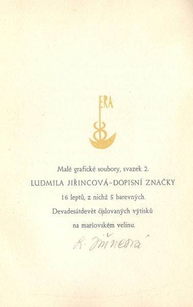 obs. 16x sign. lept (5x bar.) L. Jiřincové, Malé grafické soubory, sv. 2, Praha, 1954, volné listy v ob., ex. 9/99 na maršovském velinu, podp. L. Jiřincové v tiráži, velmi dobrý stav